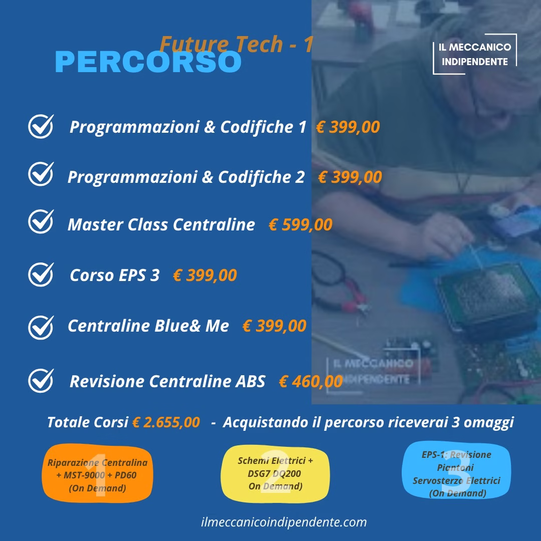 Scopri il nuovo Percorso Formativo Future Tech – 1, pensato per i meccanici e i meccatronici che vogliono diventare veri specialisti nelle centraline elettroniche e nelle nuove tecnologie di diagnosi e programmazione.